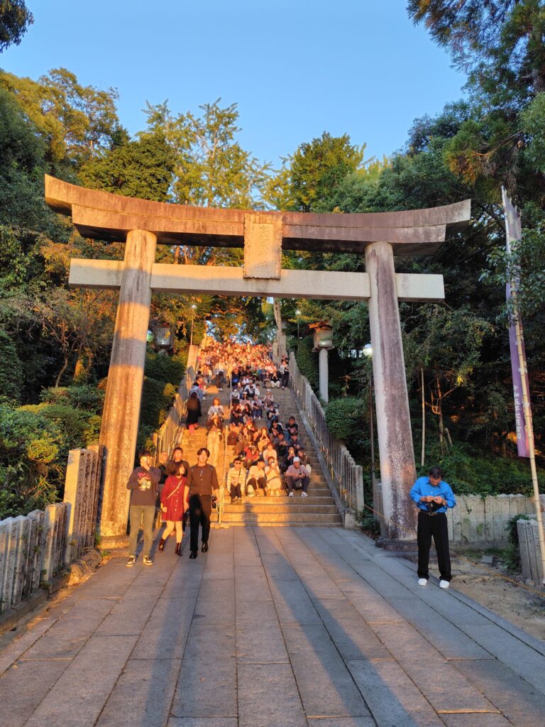 神社の階段に着くと、夕日のまつりが終了しているにも関わらず多くの人が座っていました。