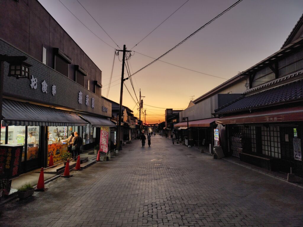 神社の階段を下りてきて参道に出ましたが、平日で夕日のまつり期間も終わったためか開いている店はまばらでした。