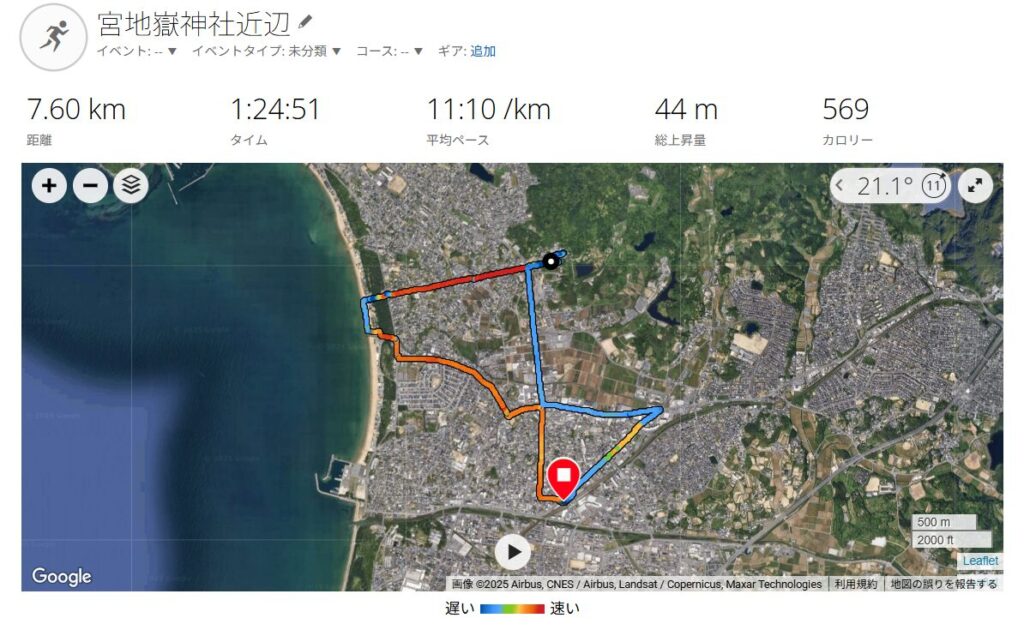上のラインは赤いほど速度が速かったことを示していますが、海岸から神社にかけての直線の道が赤が濃くなっています。