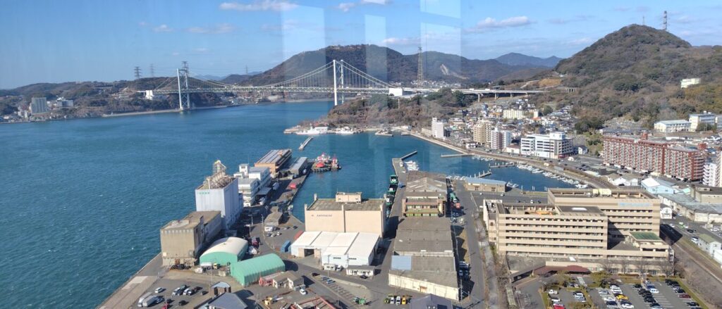 門司港レトロ展望室の後は、写真の関門橋のさらに奥の「関門トンネル人道」まで歩きました。