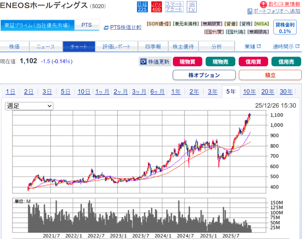 そして、現在のENEOSの株価は1,100円前後をウロウロとしています。