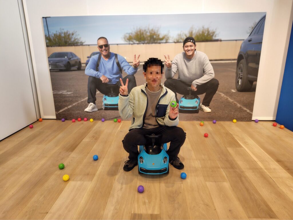 - 2020年の本物チャンピオンリングを着けて、2024年ワールドシリーズ優勝トロフィーと記念写真を撮ることができる。(上の写真)