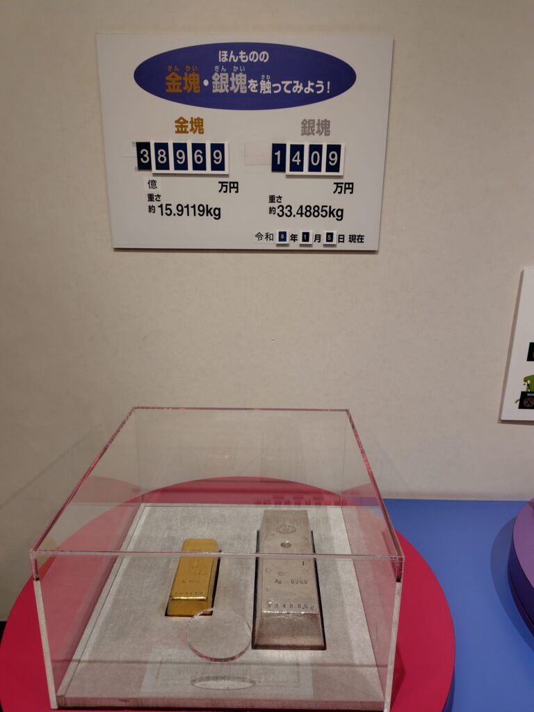 去年に行った、東京の貨幣博物館には1億円を持つコーナーがありましたが、それは1万円札と同じサイズの紙で本物ではなかったので、造幣博物館は太っ腹だなと思いました。