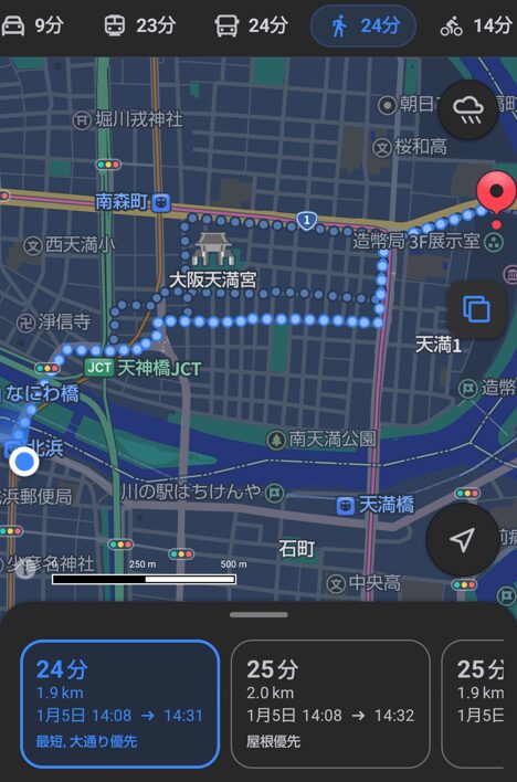 私の場合、大阪取引所にいたので、そこから造幣局の地図を調べると1.9kmほどだったので、
